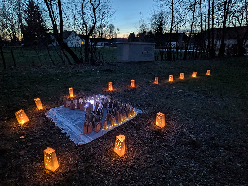 Mit Laternen und Taschenlampen ausgerüstet machten sich Kinder und Erwachsene gemeinsam auf den Weg zum Parkplatz beim Reiterstüberl. Die Wanderung war geprägt von fröhlichem Kinderlachen und dem warmen Licht der vielen Laternen. Am Ziel angekommen, erwartete die Kinder eine besonders gemütliche Szenerie: Lichterketten und Kerzen sorgten für eine besinnliche Stimmung.